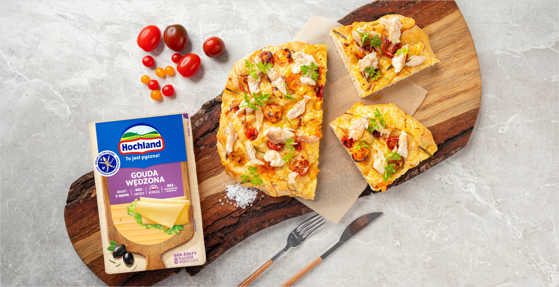 FOCACCIA Z ROZMARYNEM, POMIDORKAMI KOKTAJLOWYMI, WĘDZONYM PSTRĄGIEM I SEREM ŻÓŁTYM GOUDA WĘDZONA